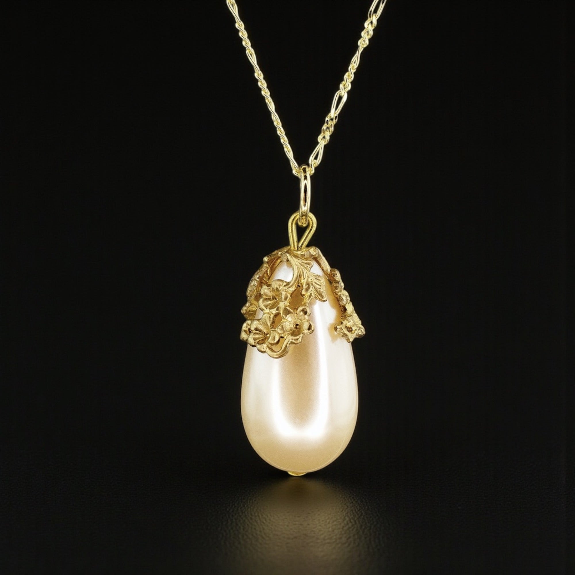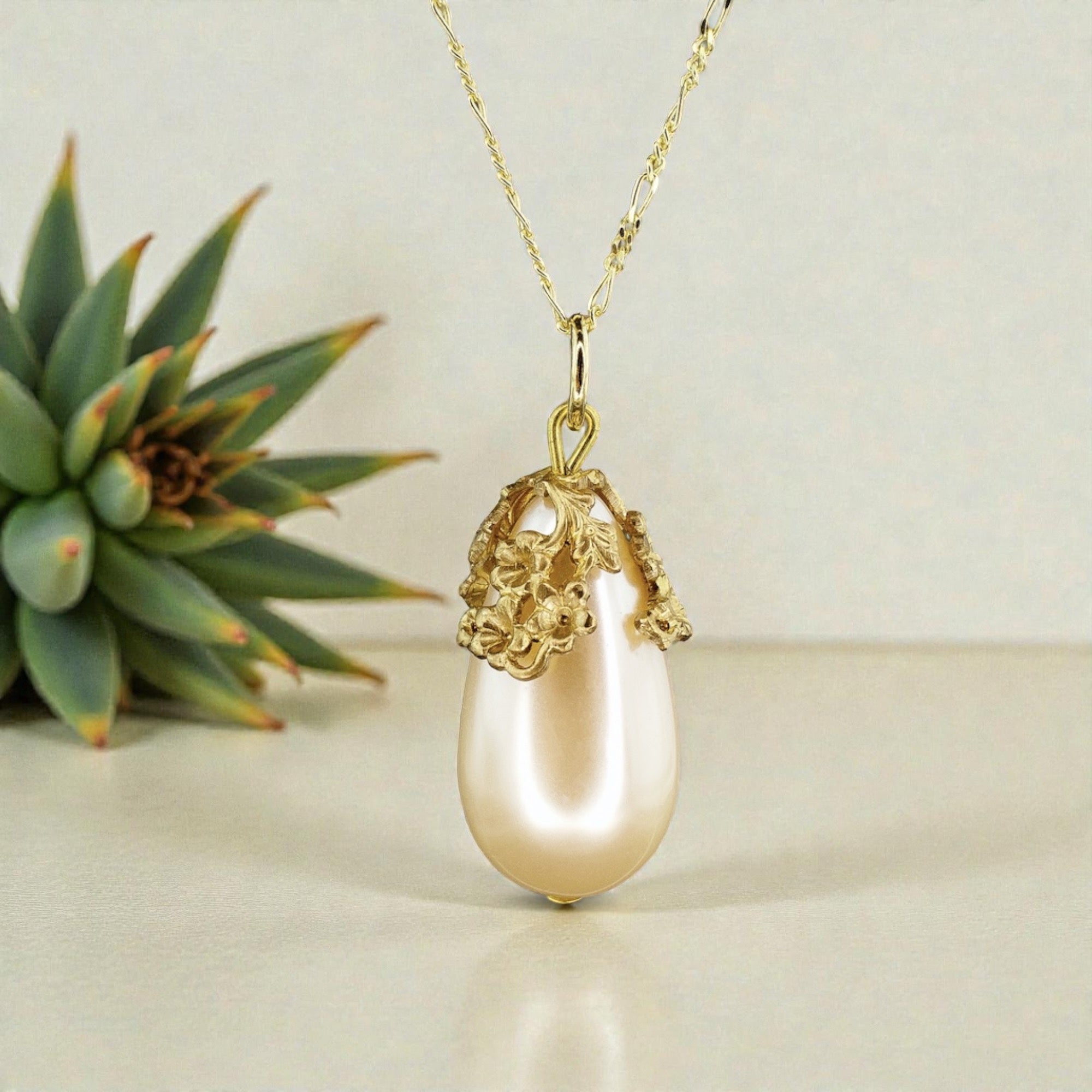 Diese 70 cm lange Halskette vereint feine Handwerkskunst mit zeitloser Eleganz. Die Kette besteht aus 925 Sterling Silber und ist mit einer langlebigen 18k Vergoldung veredelt. Der 3,5 cm große Anhänger ist eine echte südkoreanische Vintage Tropfenperle, umrahmt von einer goldfarbenen, hochwertig gearbeiteten Perlenkappe, die dem Schmuckstück einen edlen, klassischen Charakter verleiht.